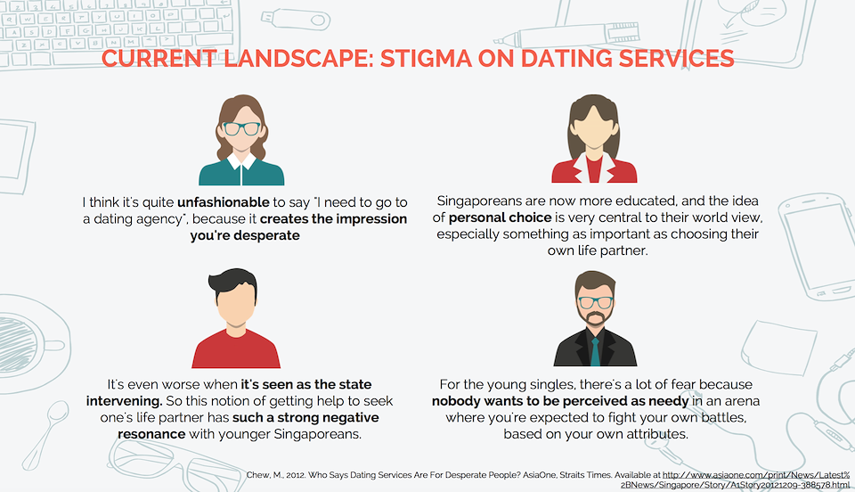 My team and I tackled Singapore Development Network’s second challenge statement and key objective: To devise a comprehensive communications plan to mitigate or remove the stigma of using dating services. The proposal should not only convince singles to use dating services to widen their social circle, but also make it a ‘cool’ thing to do.