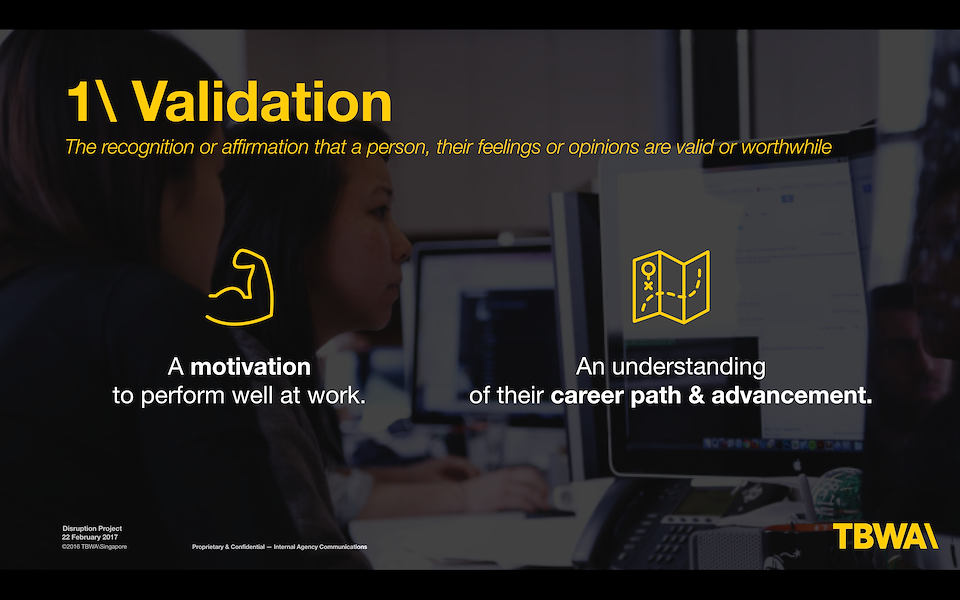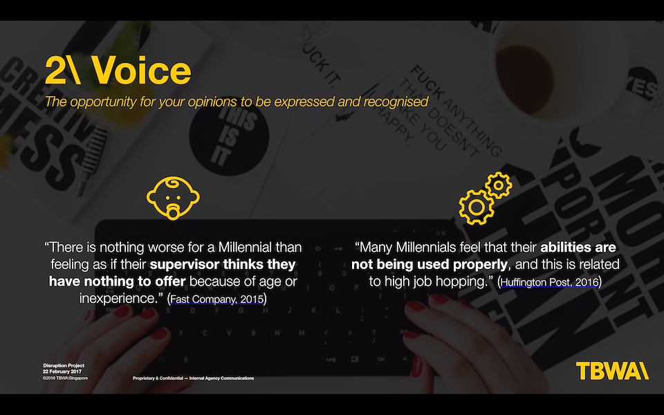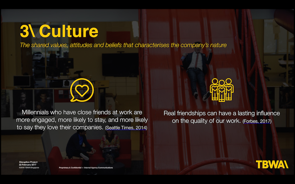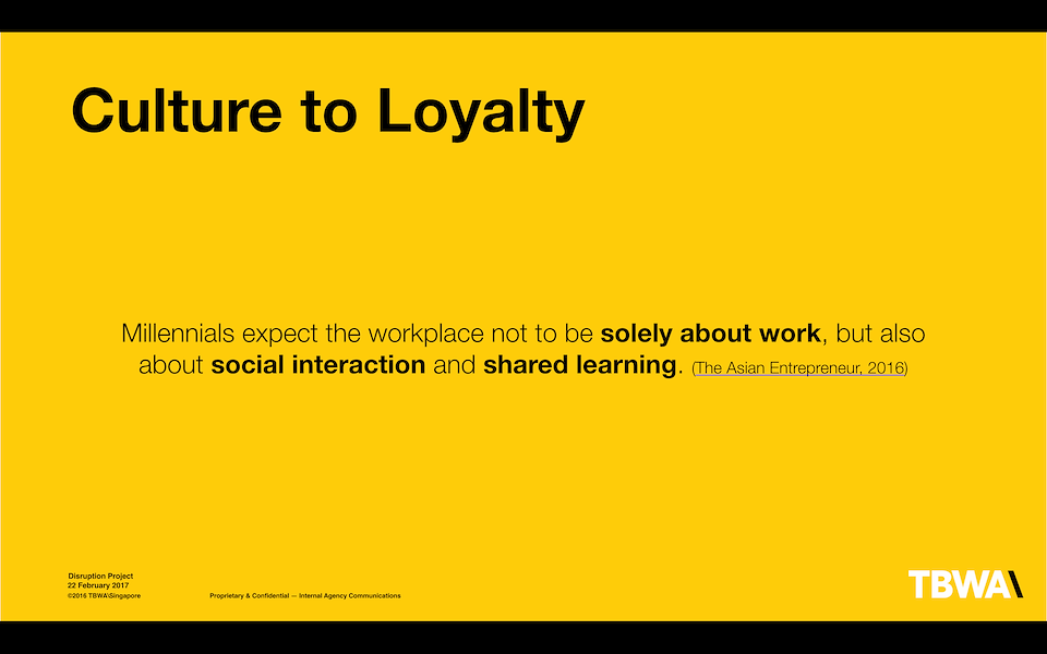 These briefs made up the Disruption Project, which we presented to our colleagues as well as the upper management. This project allowed interns to work on one of TBWA's clients and apply what we had learnt. It also encouraged us to work and ideate with the company’s ethos of disruption in mind.